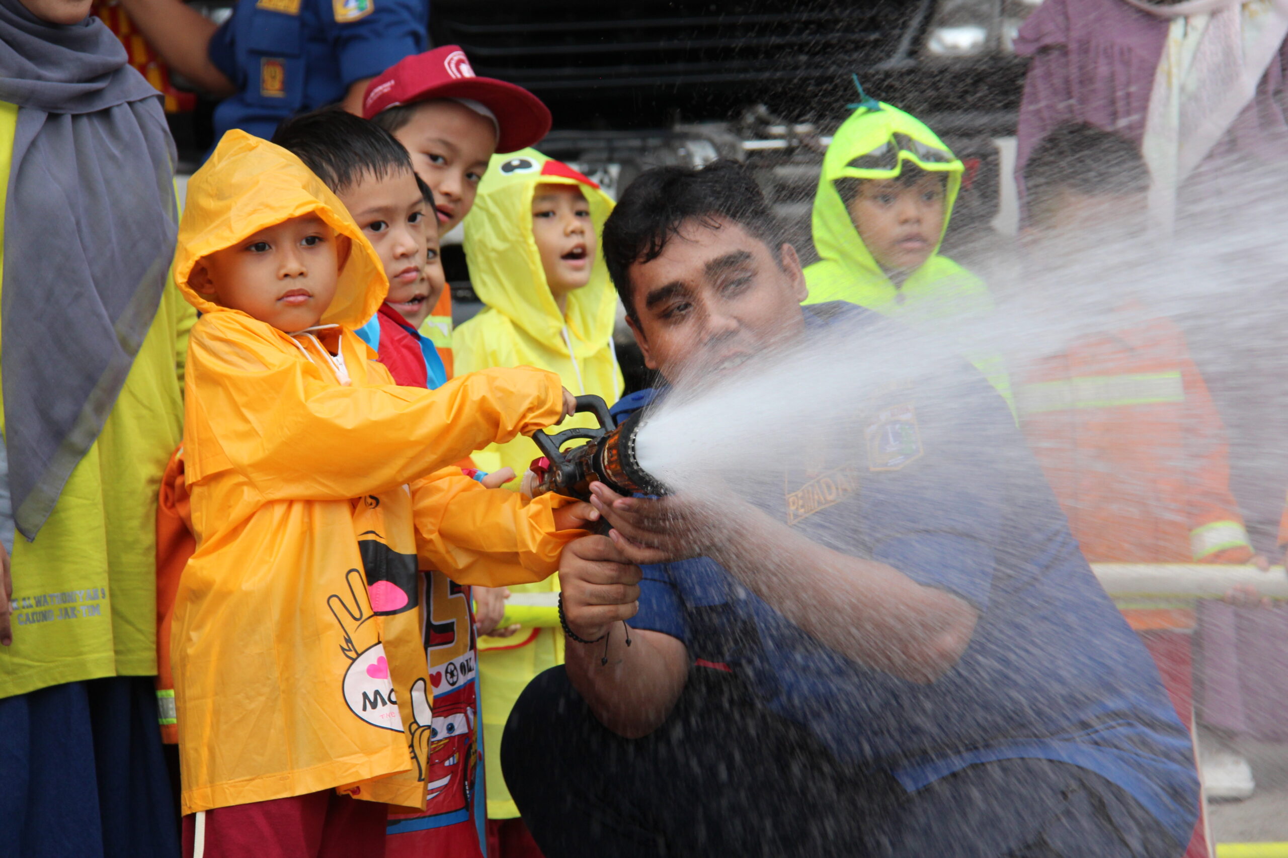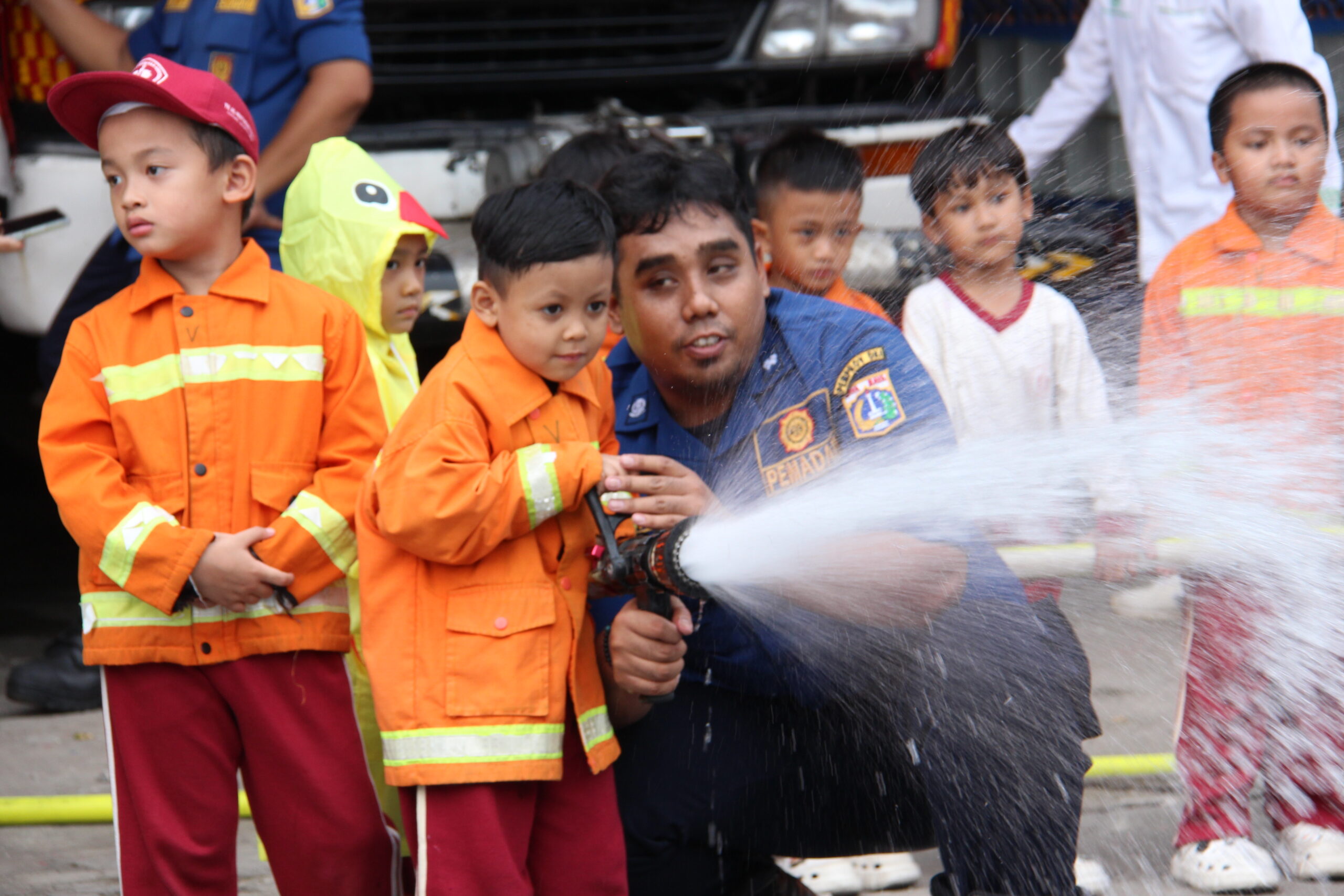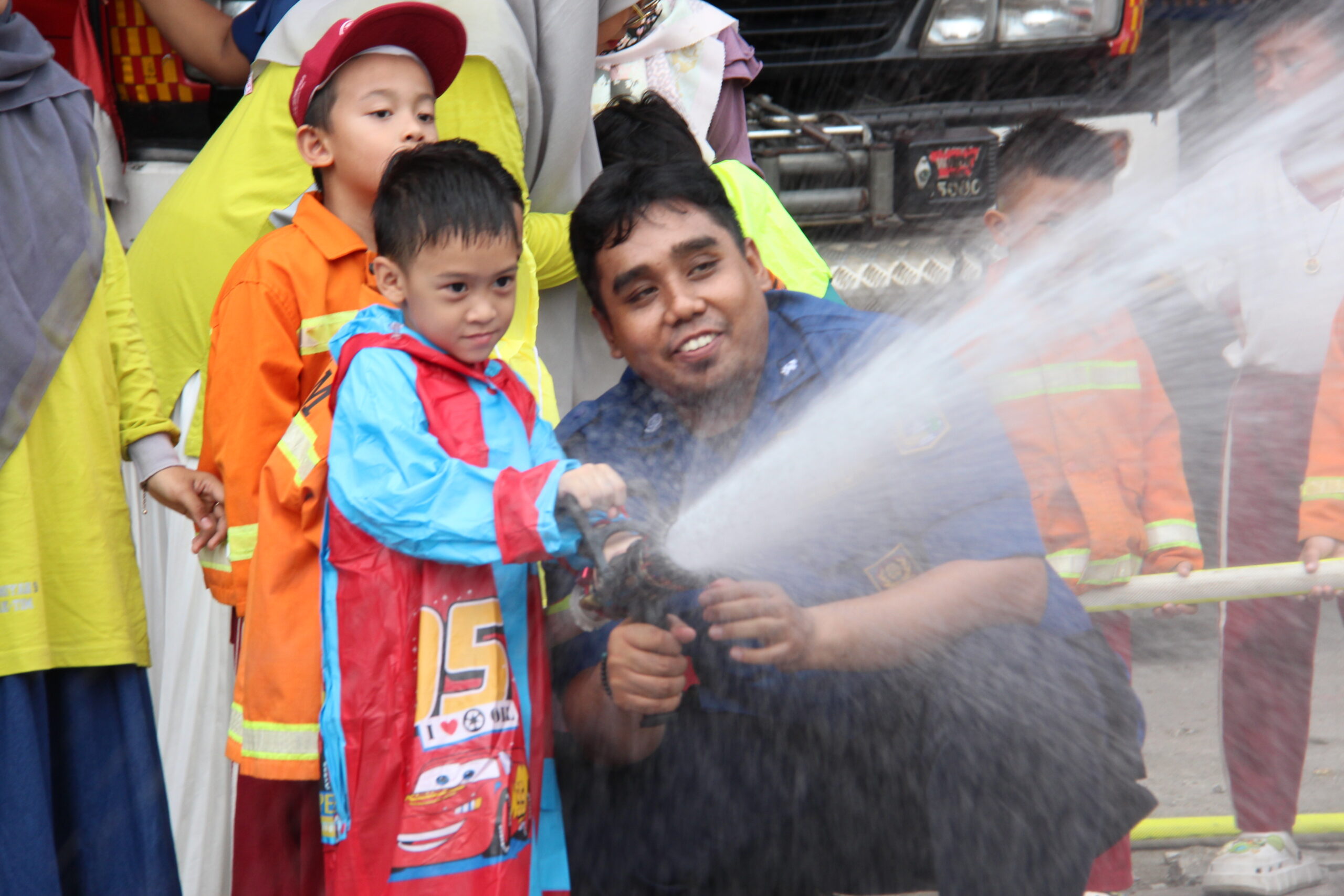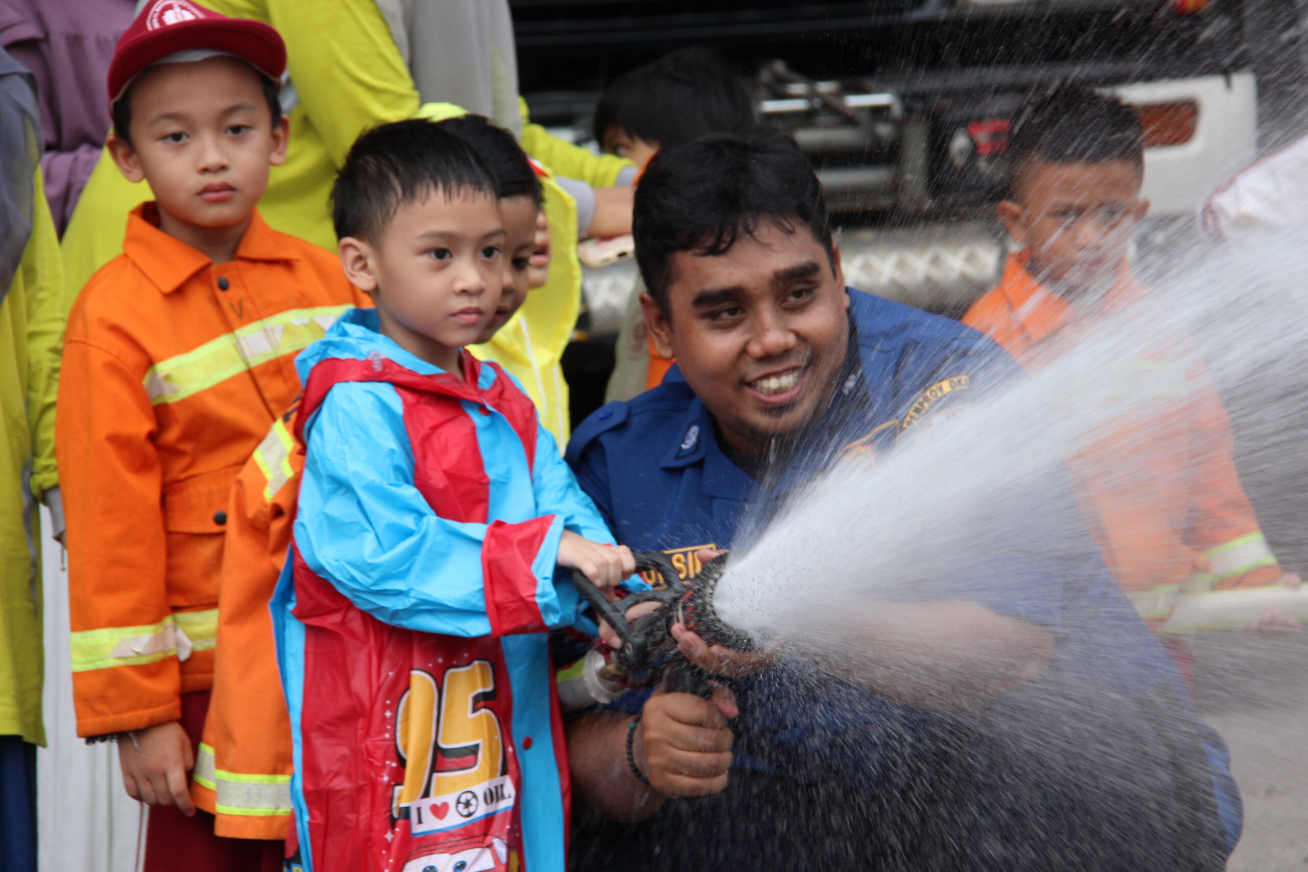 Momennya tiba ketika anak-anak diperkenankan untuk merasakan bagaimana cara memadamkan api secara aman. Dalam suasana simulasi yang terkontrol, mereka diajak untuk menggunakan selang air kecil dan menyemprotkan air ke “api”. Dalam kegembiraan, mereka belajar bahwa keselamatan adalah hal yang utama dan diperlukan kehati-hatian dalam situasi darurat.
