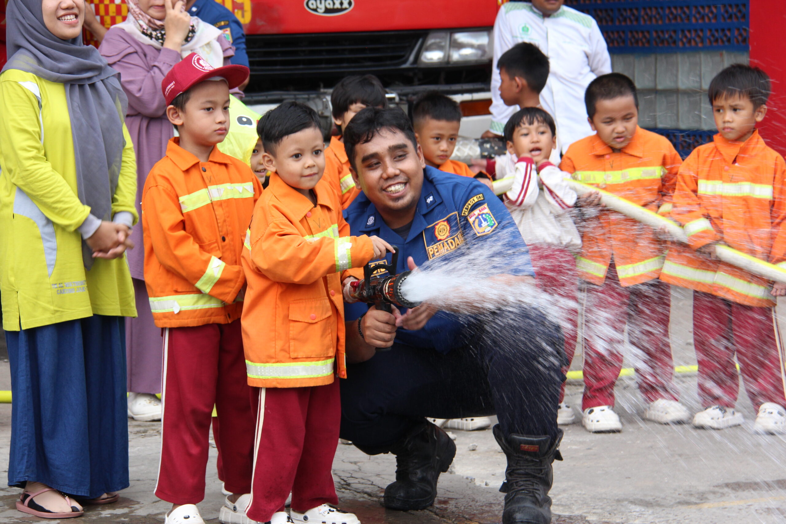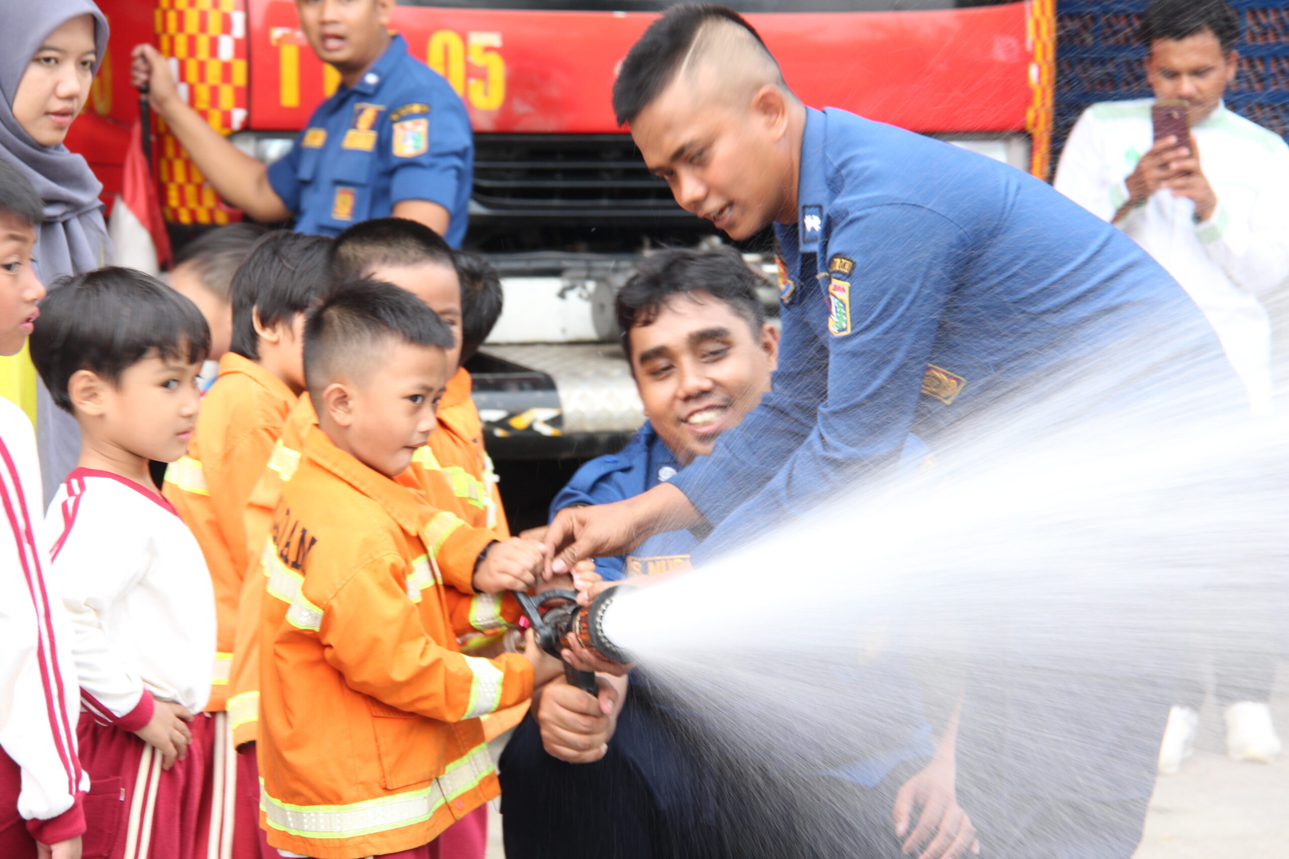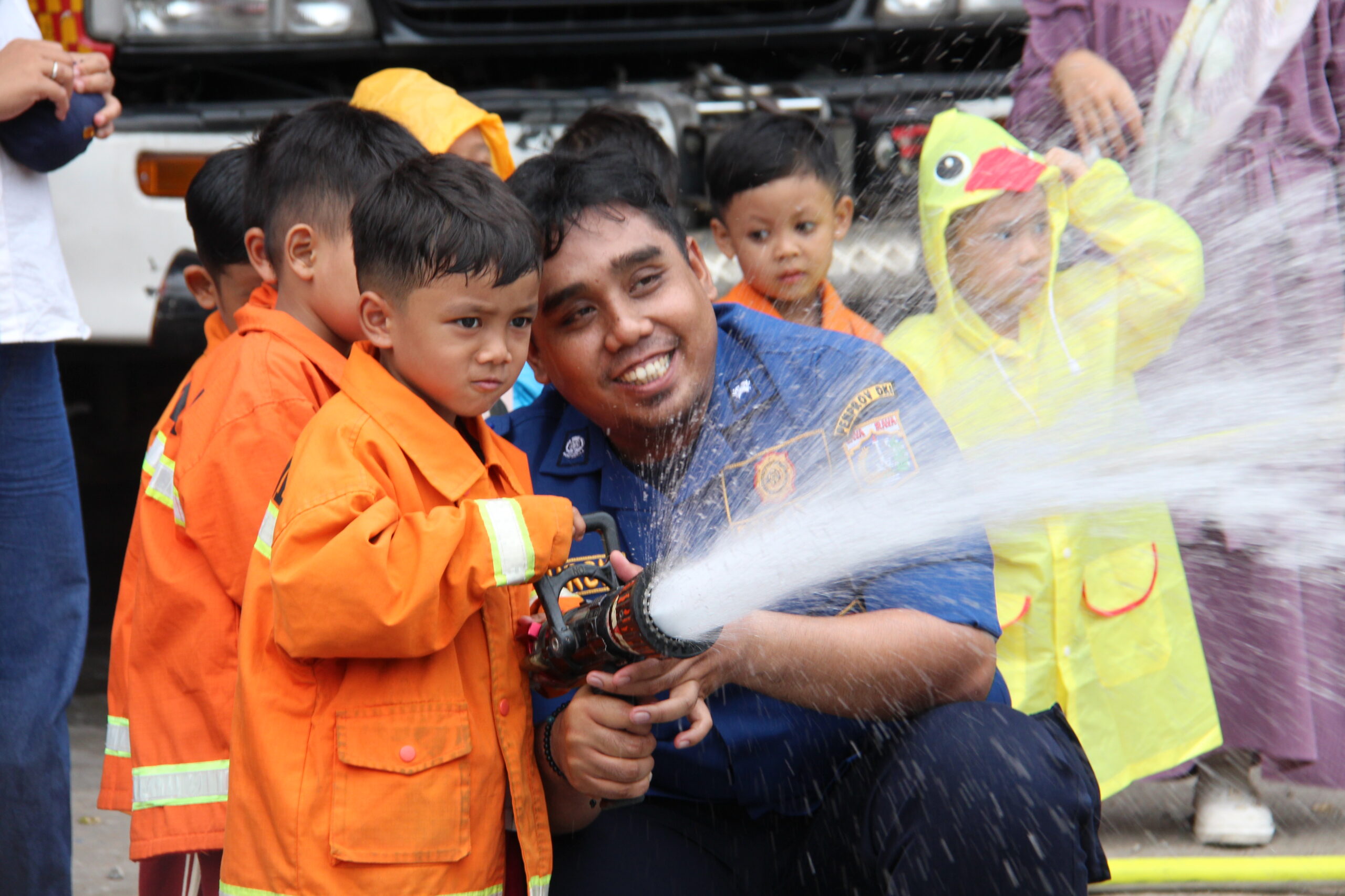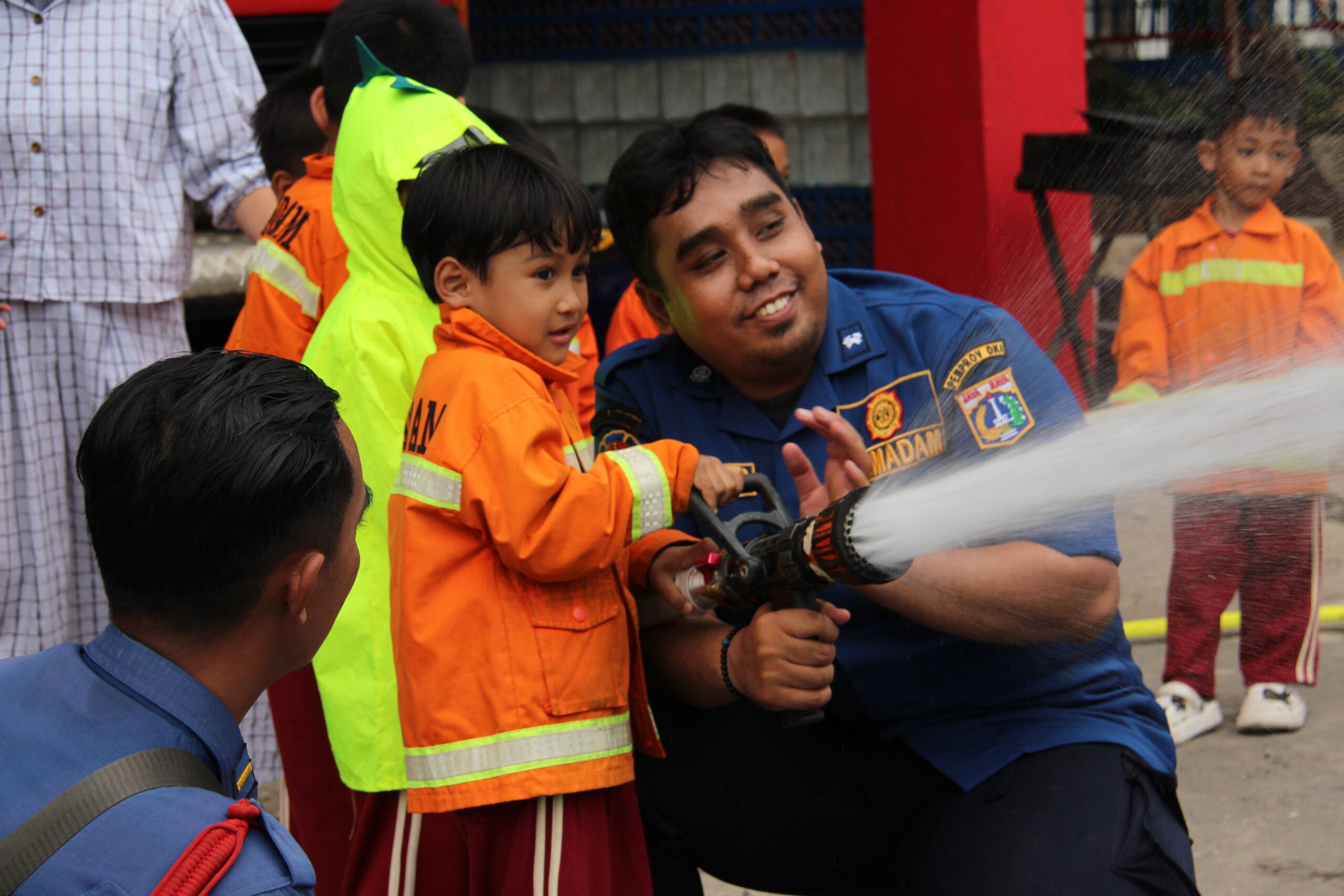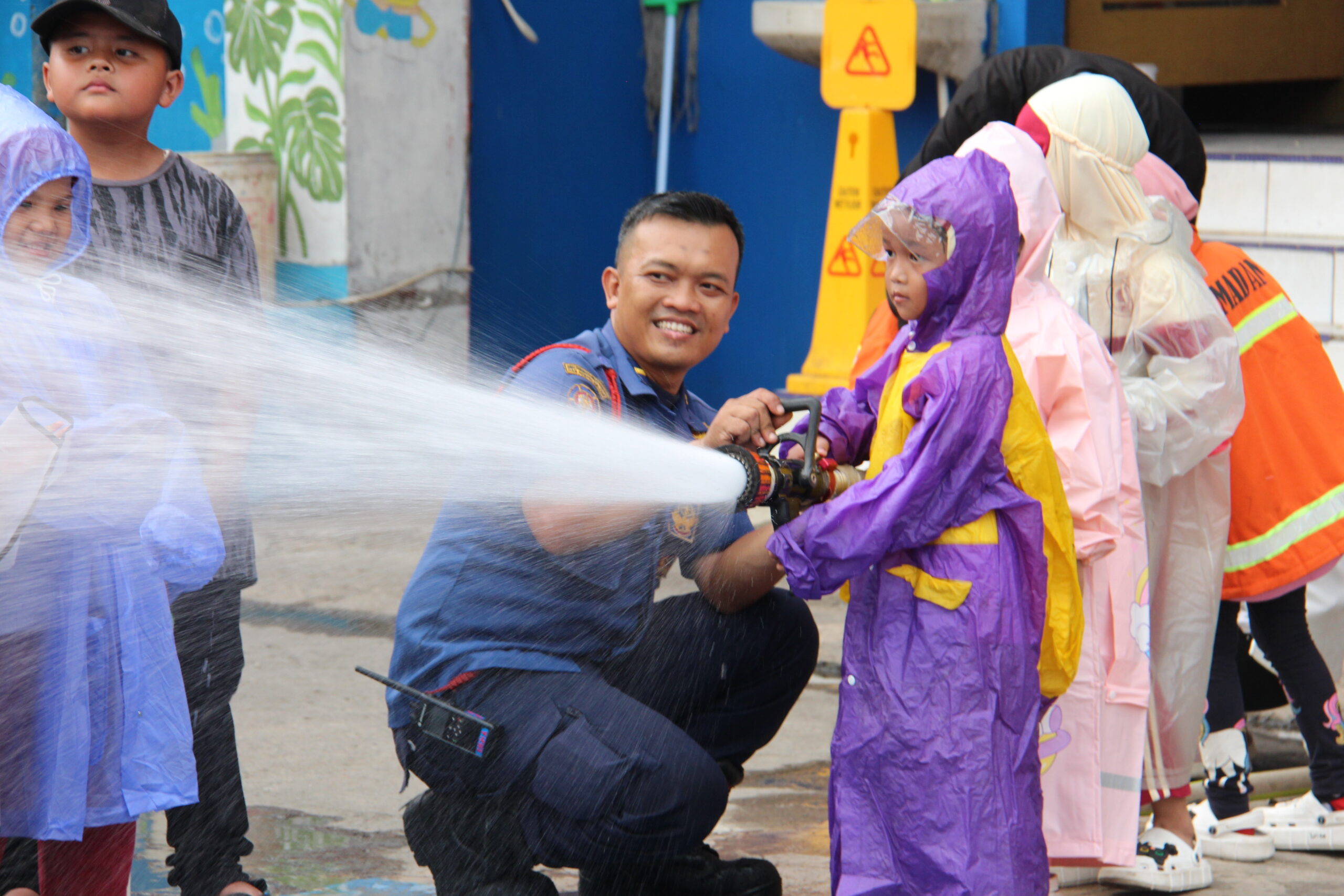 Momennya tiba ketika anak-anak diperkenankan untuk merasakan bagaimana cara memadamkan api secara aman. Dalam suasana simulasi yang terkontrol, mereka diajak untuk menggunakan selang air kecil dan menyemprotkan air ke “api”. Dalam kegembiraan, mereka belajar bahwa keselamatan adalah hal yang utama dan diperlukan kehati-hatian dalam situasi darurat.